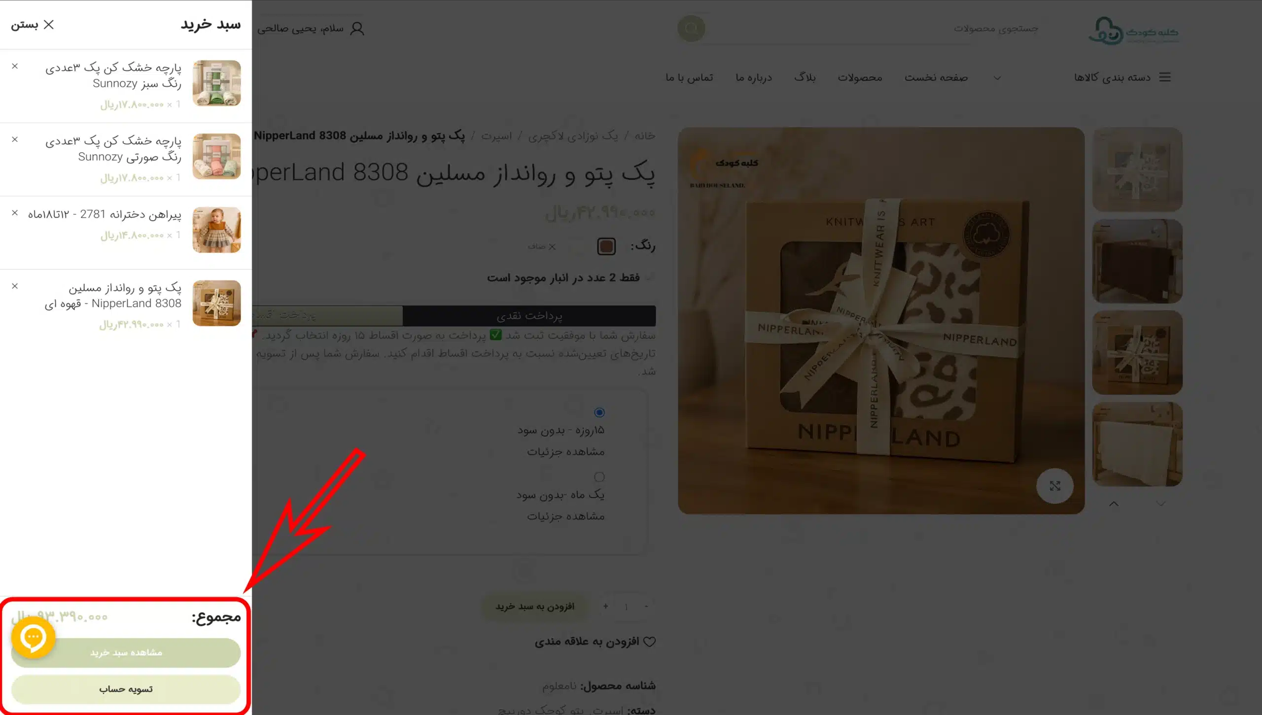 ۷. با کلیک روی دکمه تسویه حساب، صفحهای باز خواهد شد که در آن میتوانید سبد خرید خود را به همراه قیمت نهایی مشاهده بفرمایید.