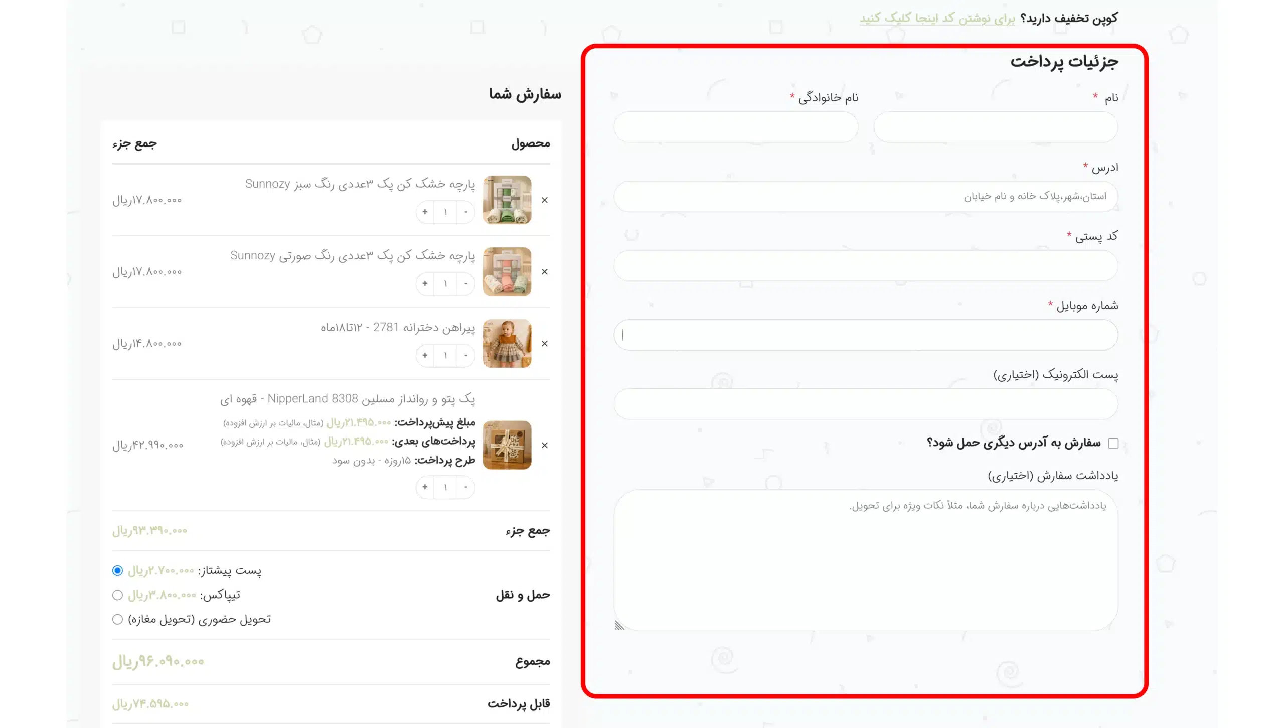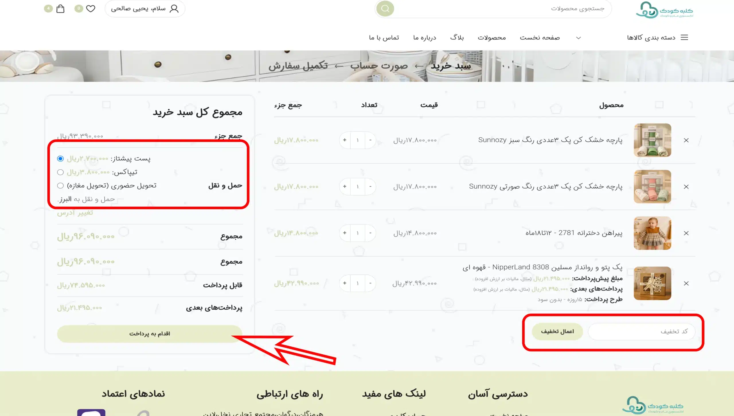 ۸. شیوه حملونقل مرسوله خود را انتخاب نمایید و در صورت داشتن کد تخفیف، با درج کد و کلیک روی اعمال کد تخفیف، میتوانید از تخفیف ویژه بهره برده و در نهایت روی گزینه تسویه حساب کلیک کنید.