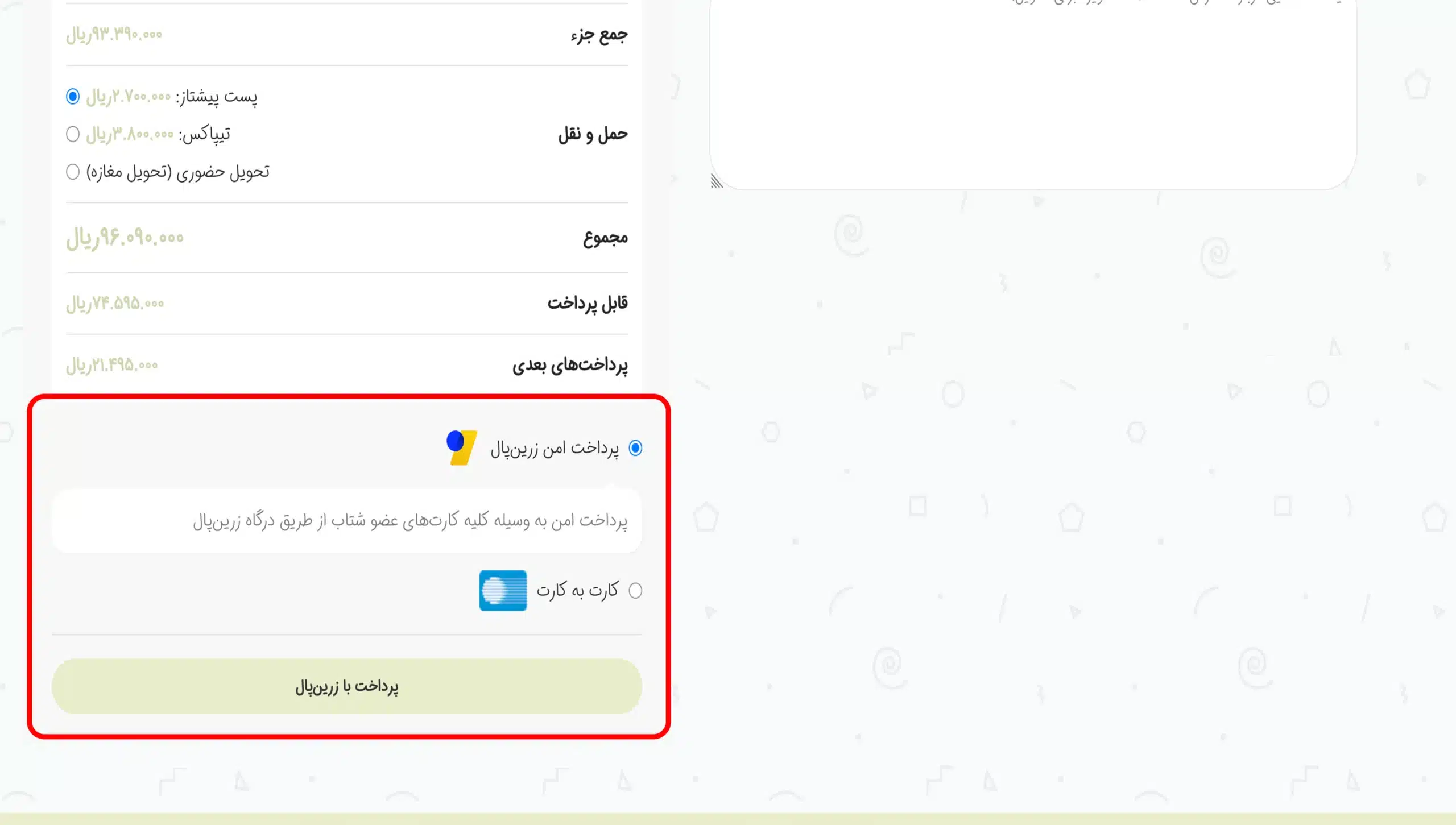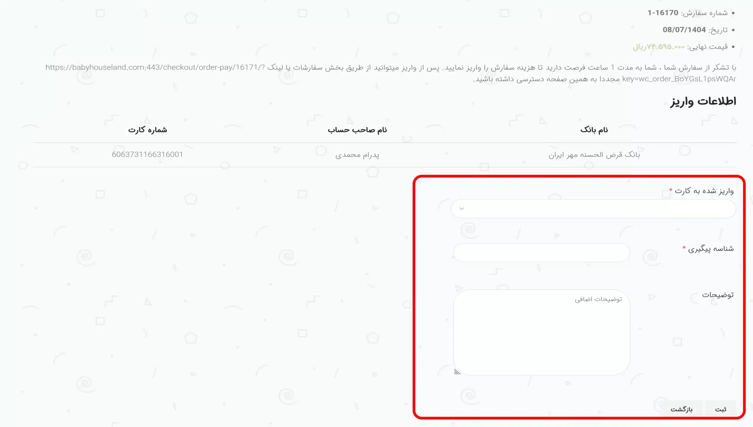 ۱۰. پس از انتخاب درگاه پرداخت مورد نظر (کارت به کارت یا زرینپال)، روی گزینه ثبت سفارش کلیک کنید. تبریک میگوییم. سفارش شما دریافت شد. جهت تکمیل سفارش، اطلاعات بانکی خود را تکمیل کنید.