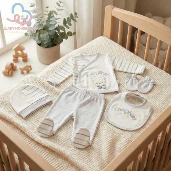 این ست شامل ۵ تکه اصلی و ضروری است که برای روزهای ابتدایی زندگی نوزاد طراحی شدهاند: