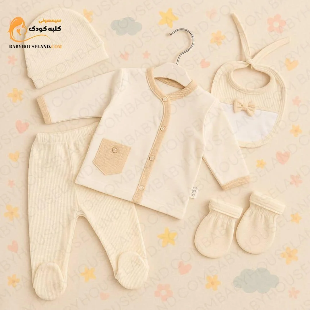 اگر به دنبال یک ست کامل، شیک و کاربردی برای نوزادتون هستید، این ست 5 تکه جذاب از برند Sebi انتخابی ایدهآل است. ترکیب رنگ کرمی و طراحی ساده اما خاص، اون رو به یکی از محبوبترین انتخابها برای سیسمونی تبدیل کرده.