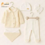 ست لباس نوزادی Tongs مدل 5464 یک انتخاب کامل و کاربردی برای کوچولوی شماست. این ست اورجینال ترک شامل کلاه، پیشبند، دستکش، شلوار و لباس میباشد که تمام نیازهای نوزاد را برای پوشش روزمره و مهمانی برطرف میکند. جنس نرم و ضد حساسیت این ست باعث میشود برای پوست حساس نوزاد کاملاً مناسب باشد و راحتی او را تضمین کند.