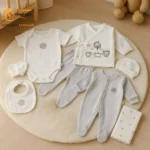 این مجموعه به دلیل استفاده از مواد کاملاً طبیعی و بدون مواد شیمیایی مضر، انتخابی ایدهآل برای محافظت از پوست لطیف نوزاد شماست. طراحی زیبا و رنگهای دلنشین آن، تجربه پوشیدن را برای کودک دلپذیرتر میکند و شما را از خریدهای متعدد بینیاز میسازد.