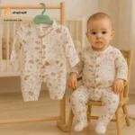 این مدل با رنگهای ملایم و طرحی فانتزی و دلنشین طراحی شده تا استایل نوزاد شما را خاصتر و جذابتر کند. استفاده از پارچه نخی طبیعی سبب میشود هیچگونه حساسیت یا خارش روی پوست لطیف نوزاد ایجاد نشود.