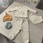 این سرویس بیمارستانی ۵ تکه با بستهبندی زیبا و طراحی هماهنگ، هدیهای ایدهآل برای نوزادان تازهمتولدشده است. ترکیب بلوز، شلوار، کلاه، دستکش و پیشبند تمام نیازهای اولیه را پوشش میدهد.