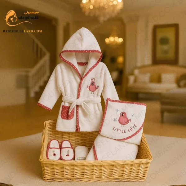 این ست فوقالعاده با طراحی دخترانه و رنگهای ملایم و کودکانه، مخصوص نوزادان از بدو تولد تا ۳ سالگی طراحی شده و شامل تمام تکههای مورد نیاز پس از حمام کودک است.