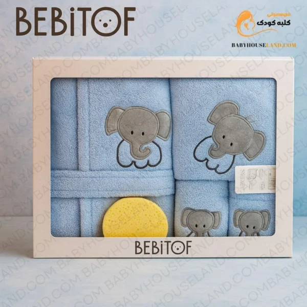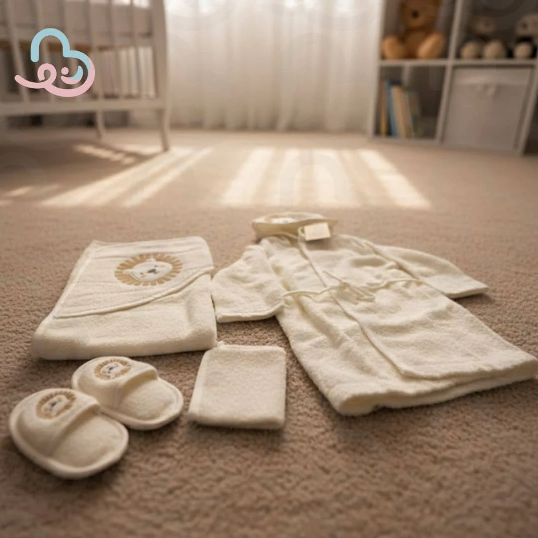 این سرویس شامل پاپوش، حوله دورپیچ، حوله تنپوش و لیف است و بهگونهای طراحی شده که تمام نیازهای بعد از حمام کودک را برطرف کند.