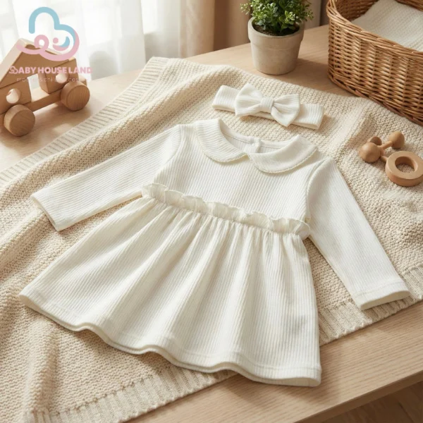 پیراهن این مجموعه با برش کلاسیک و طراحی آزاد، ظاهری زیبا و دخترانه دارد. دکمههای پشتی یا مخفی در جلو باعث سهولت در تعویض لباس میشوند و از اذیت شدن نوزاد جلوگیری میکنند. چاپها یا گلدوزیهای ظریف روی پارچه با رنگهای طبیعی انجام شدهاند تا در برابر شستشو ماندگار و ایمن باشند. هدبند همراه این ست نیز از همان جنس پیراهن ساخته شده و با پاپیون یا گره تزئینی طراحی شده تا استایل نوزاد را کامل کند.